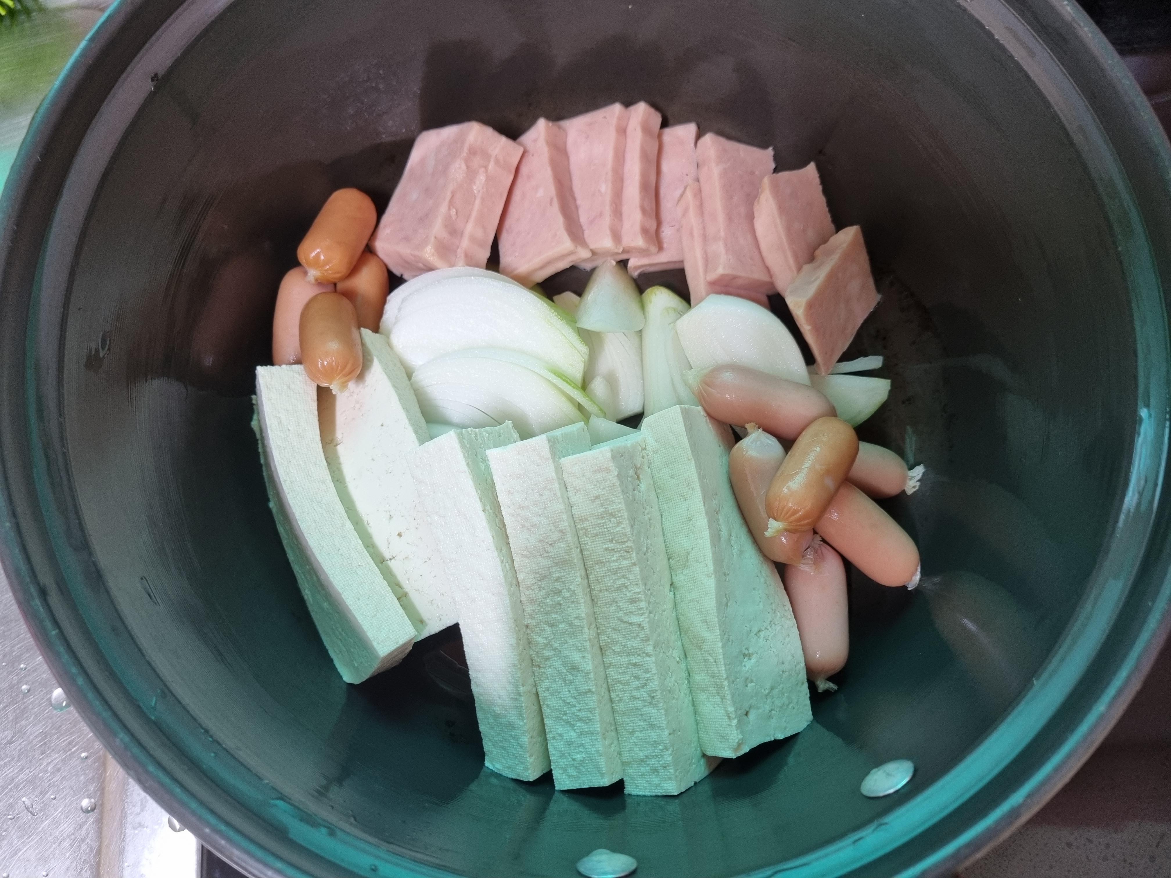 2. 양파, 햄, 두부를 먹기 좋게 썰어 냄비에 넣어줍니다.