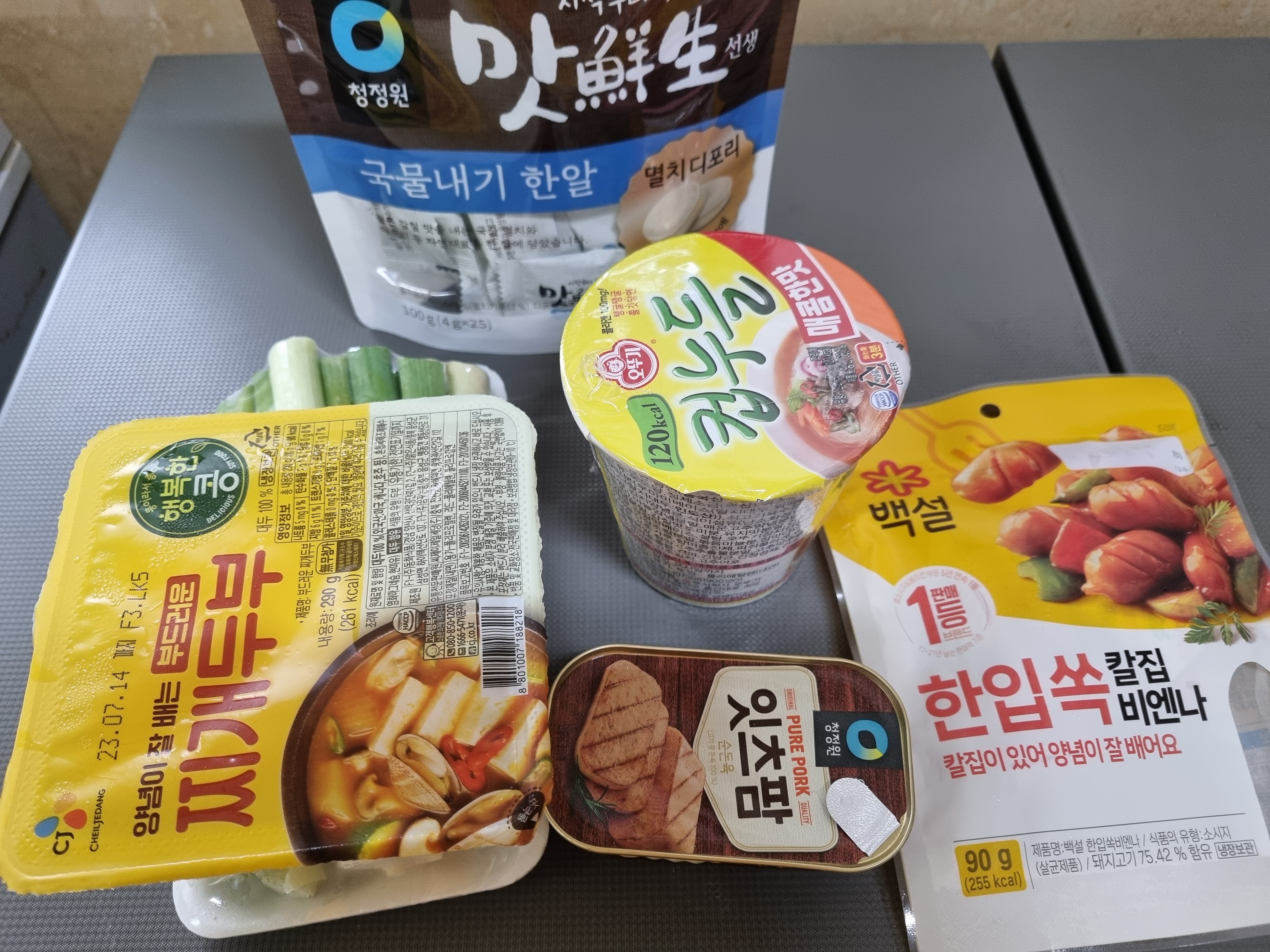 재료: 두부, 스팸, 비엔나소시지, 컵누들(매콤한맛), 대파, 코인육수