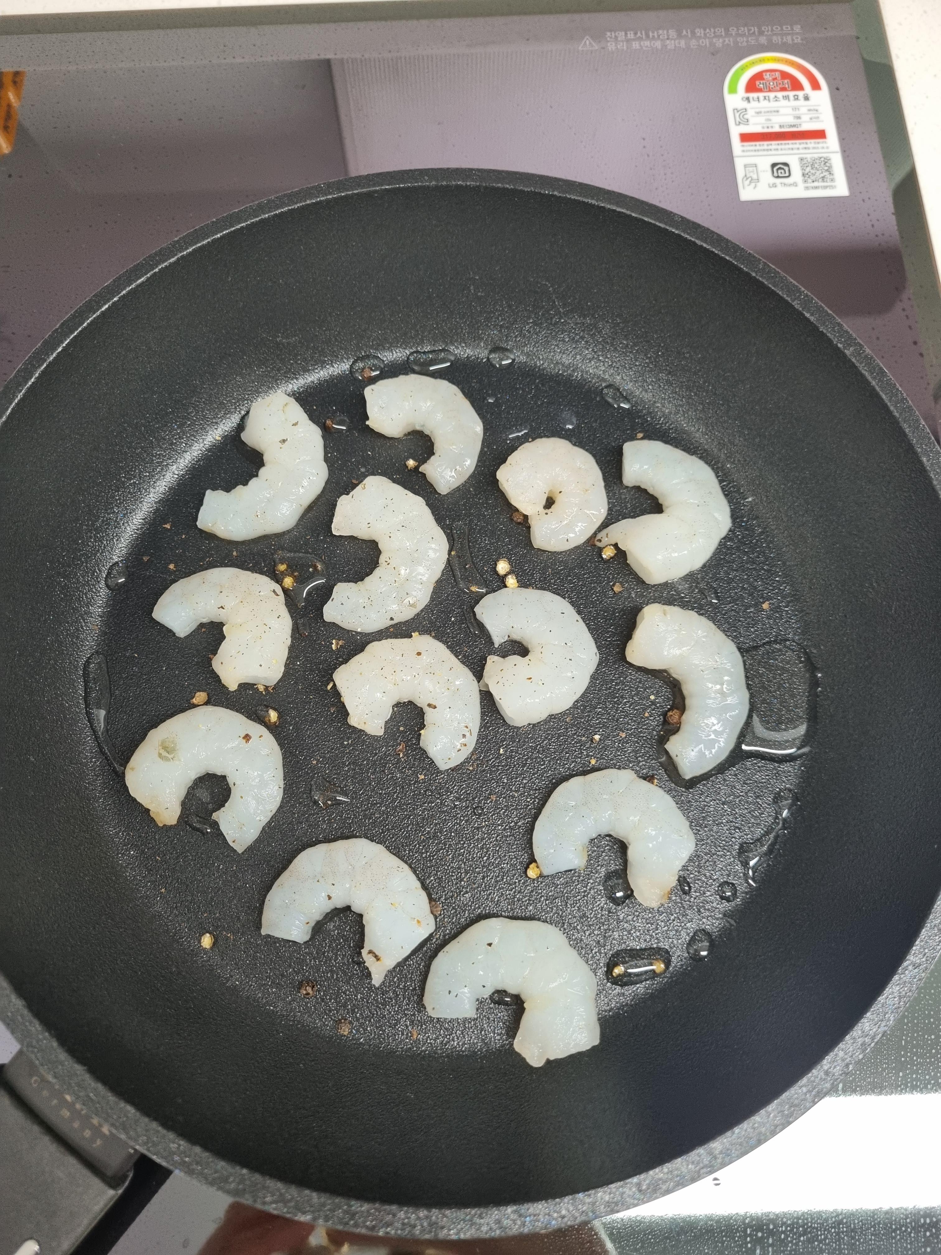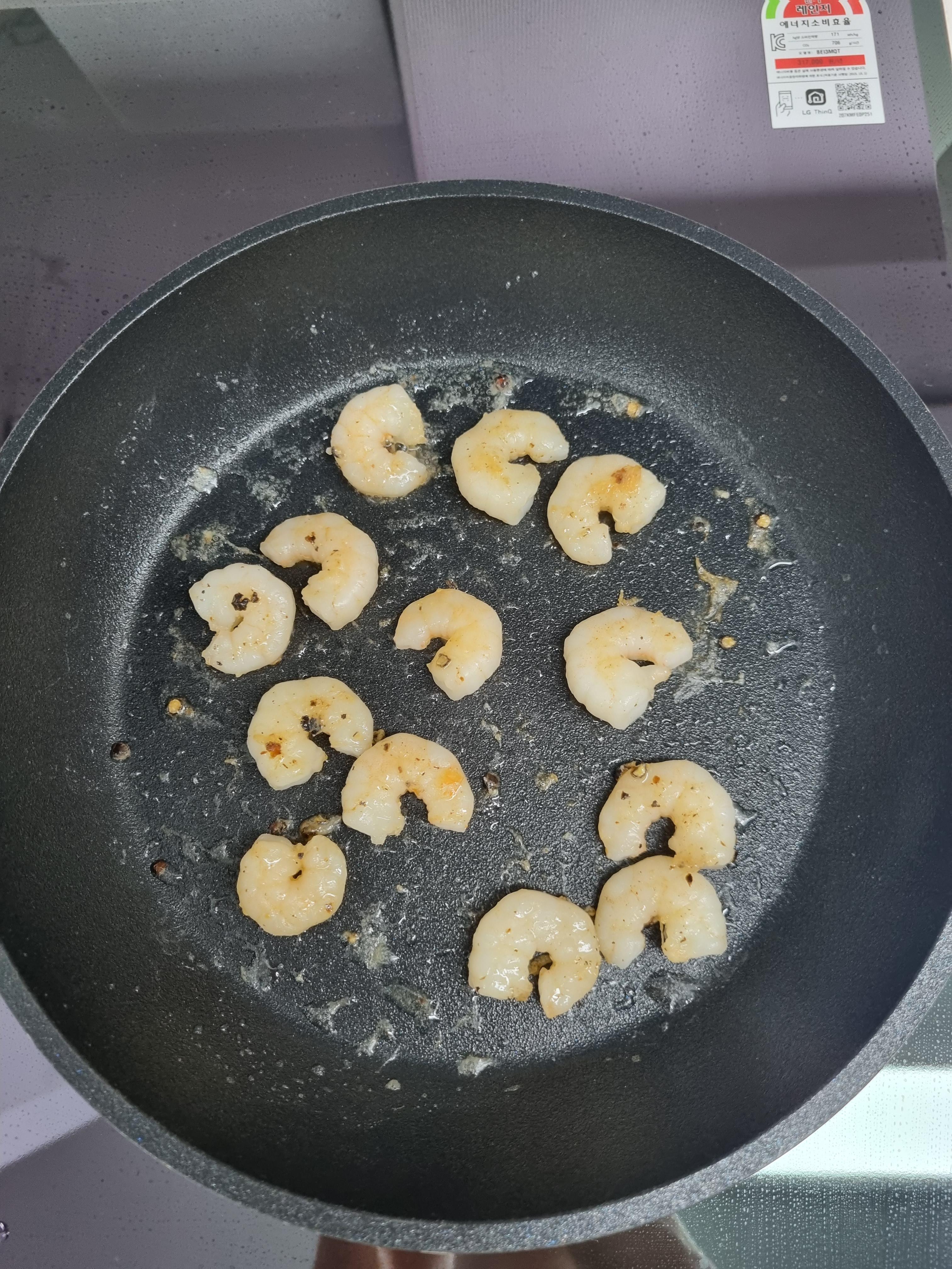 물기를 제거한 새우를 기름을 두른 프라이팬에 노릇노릇 구워줬어요