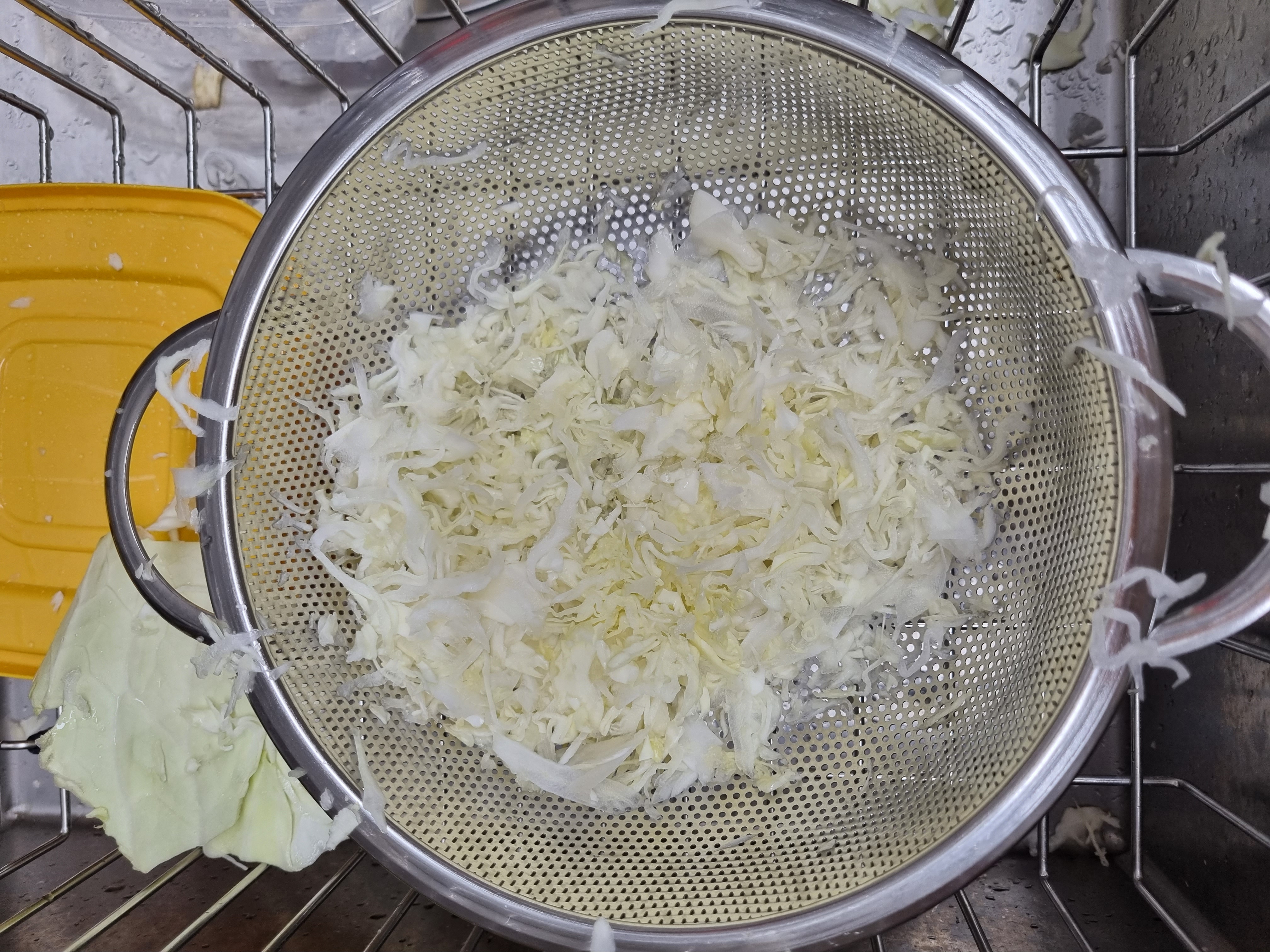 먹을 만큼 양배추를 채칼로 잘라서 물기를 빼줍니다.